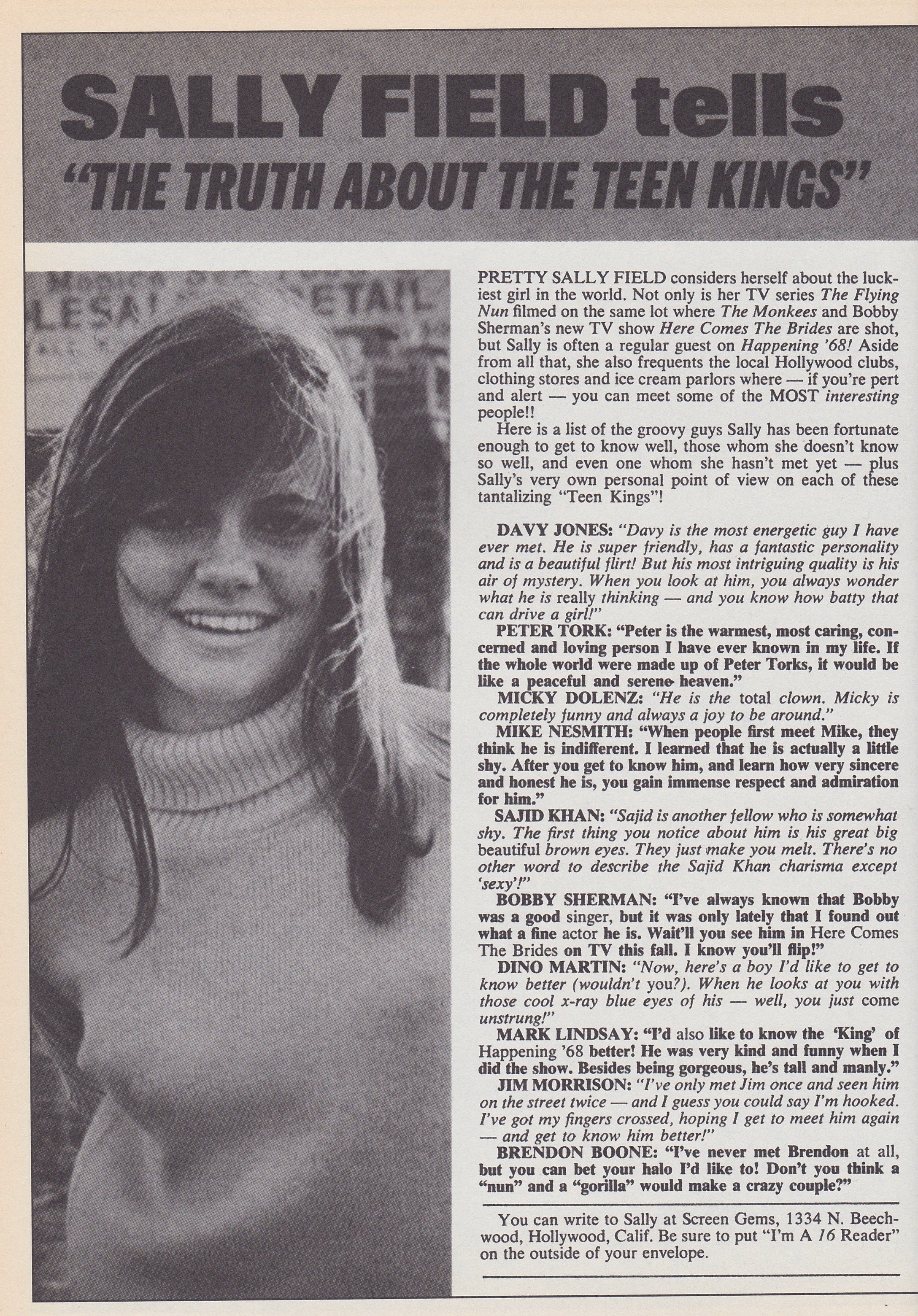 From the pages of 16 Magazine, what Sally Fields really thinks of the Monkees, Bobby Sherman and more!